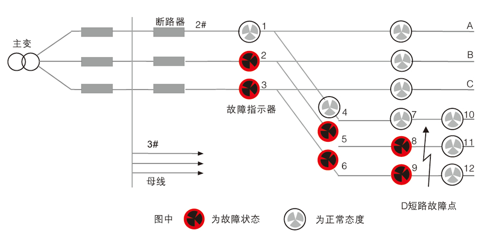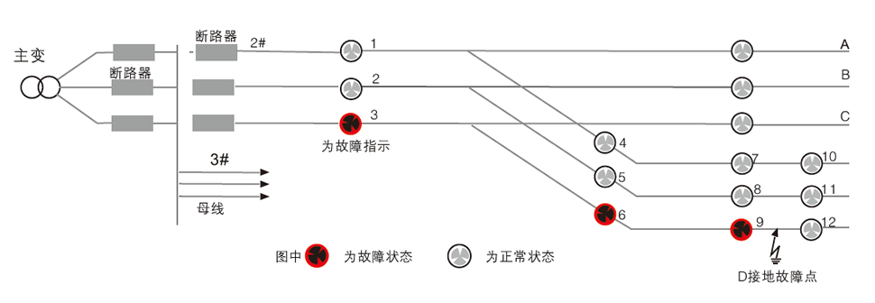 由2#線C相3、6、9指示器白天翻紅牌顯示,而12指示器仍為白色即可判斷出D點發生接地故障。